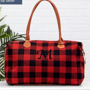 - Lakeside Collection Monogramed Red and Black Plaid Overnight Bag Letter “T”