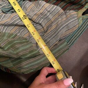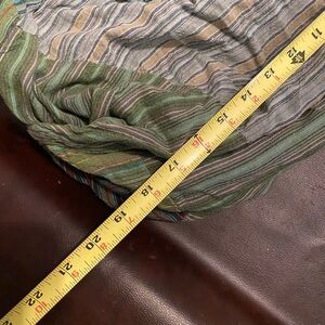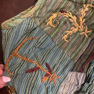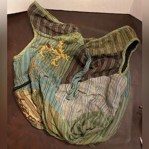Very cute and boho. It’s shaped like a t shirt with a tie in the center. One zip pocket on the side. Hand stitched accents on both sides. Possibly reversible? Black inside. Very good condition. Lots of storage in this good sized bag. Lakhays collection, Los Angeles.
