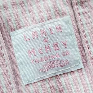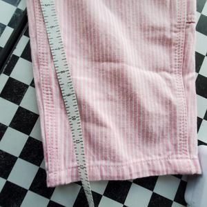 These are a pair of overalls by Lakin McKey. They are light pink and white striped all over. Pockets on front and back and on side of leg. They snap on the sides and they have fastens on the adjustable straps.