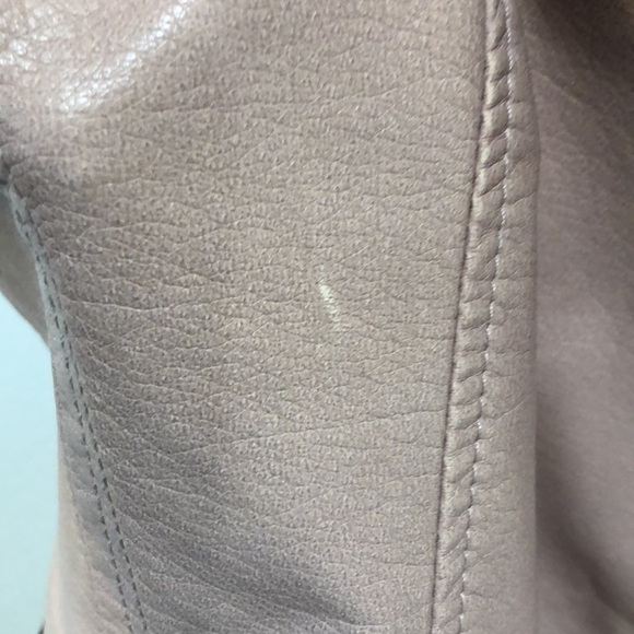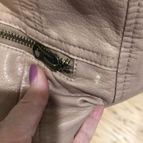 LAL Live a Little faux leather vest in a soft blush color. Asymmetrical front zip. Two front zipper pockets. Very good pre-owned condition. Small color variation on the front. Discoloration and wearing near right pocket. Tiny indentation on back. All of these imperfections are shown in pictures. Size M.
