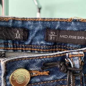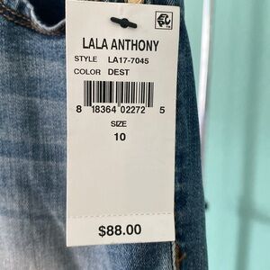 # LA17-7045 Add effortless edge to your wardrobe with these Lala Anthony Women’s Distressed Skinny Jeans in size 10/31. Designed in a versatile Dust Blue wash, these jeans feature a flattering mid-rise fit and stylish distressed detailing at the knees and thighs for a modern, worn-in look. Crafted from a comfortable stretch denim blend, they hug your curves while offering ease of movement. Style # LA17-7045 includes classic five-pocket styling, a button and zip fly closure, and subtle fading for that lived-in vibe. Perfect for casual days or dressing up with heels and a blazer.