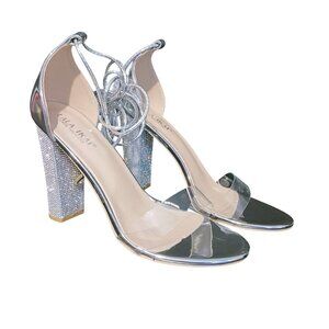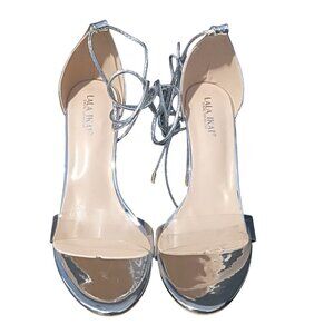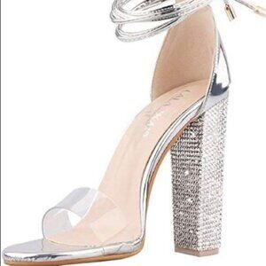 Lala Ikai Silver Rhinestone Block Heel Ankle Wrap Sandals w/ Clear Straps, 39.5