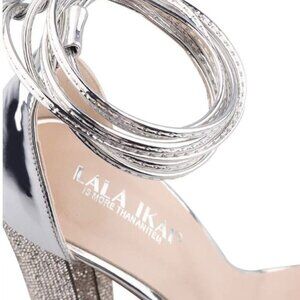 Keywords: silver block heels, rhinestone sandals, wrap tie sandals, Lala Ikai shoes, clear strap sandals, evening heels, party shoes, women's sandals, silver heels, ankle tie heels, high heel sandals, formal shoes, embellished block heels