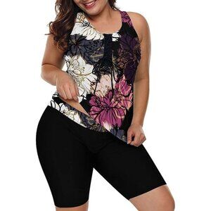 tankini, plus size, swimwear, floral pattern, beachwear, poolside, racerback, capris, chic swim, lace detail, active swim, 3X, modest coverage