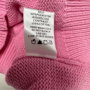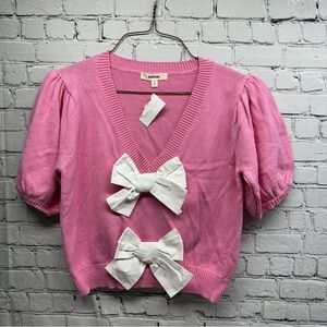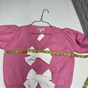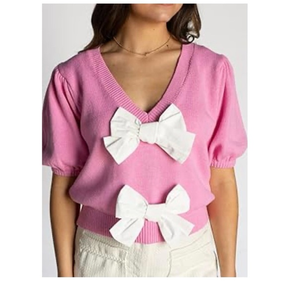 Chic pink sweater featuring stylish white bows. Perfect for a trendy look.