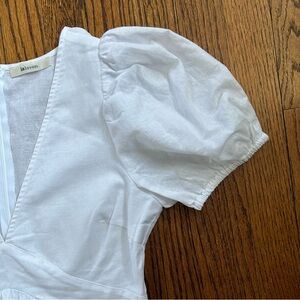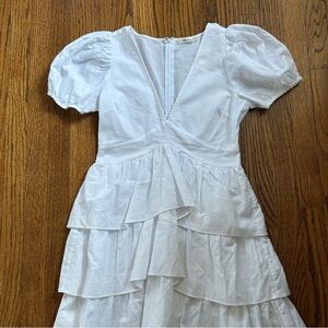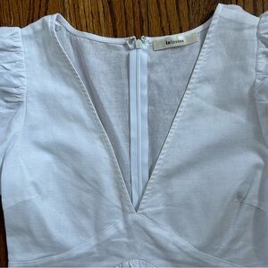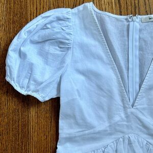 Crisp white summer mini dress. Only worn once. There is a hidden zipper in the back that goes from the neck to the bottom of the waistband. The deep V-neck of the bodice is sexy and the skirt is flirty and fun. Smoke-free and pet free home.
