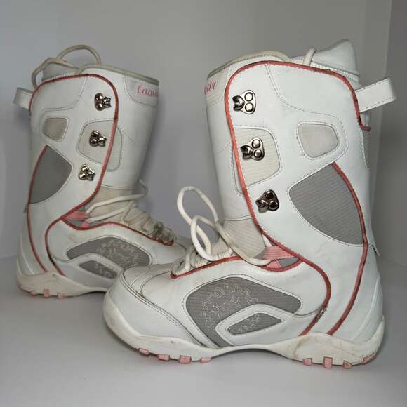 Lamar Women's Snowboard Boots, Size 9. These boots feature a stylish white and pink design, perfect for hitting the slopes. Designed for comfort and performance, they are a great choice for any female snowboarder. Excellent condition, ready for your next adventure.
