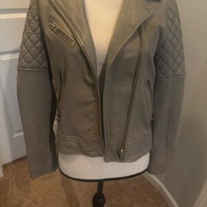 Stylish gray leather jacket with quilted sleeves. Features zippered pockets and sleek design.