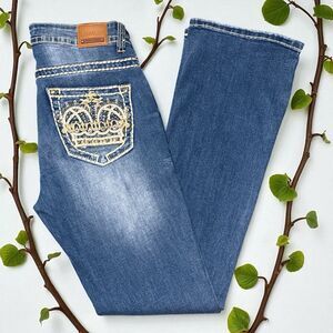 Stylish womens jeans by Lamasini featuring bold crown embroidery with rhinestone accents on the back pockets. Medium wash denim with light fading and contrast stitching. Bootcut leg for a flattering fit.