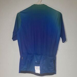 This is a Lambda brand cycling jersey in a vibrant blue and green gradient. It's a great jersey for performance and style, but please note that sizing runs small.