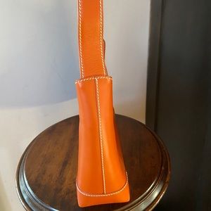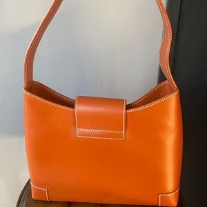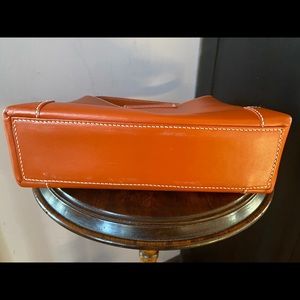 Lambertson Truex burnt orange leather bag with white stitching and suede interior, stainless steel hardware. Four pockets inside. Minimal wear outside and a faint stain inside as in photos. Excellent preowned condition, looks new. 11” wide 9” high and 9” drop.