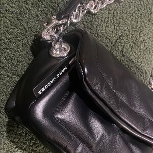 This small black crossbody bag is crafted from leather and features a glossy finish. It includes a thin adjustable strap for versatile wear and a striking silver chain detail that adds a touch of elegance. Perfect for carrying your essentials in style.