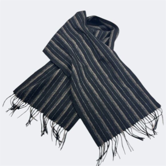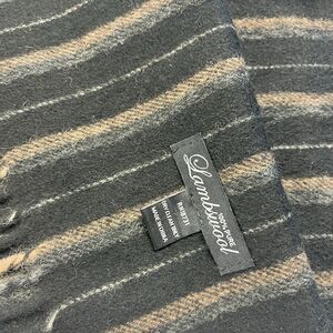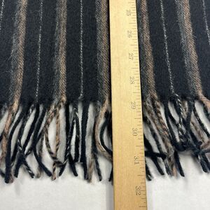 Classic unisex lambswool scarf in black with brown and tan stripes. Soft, warm, and lightweight with fringed ends.