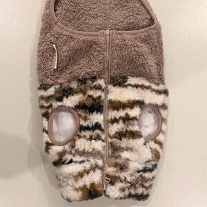 Adorable two-tone sherpa dog jacket featuring a warm fleece texture and a stylish animal stripe pattern on top. Comes with a convenient built-in D-ring for leash attachment — perfect for quick walks or chilly days.