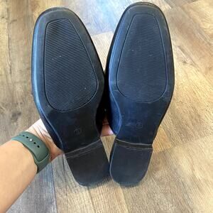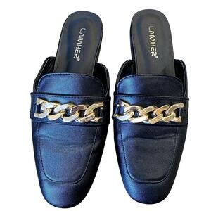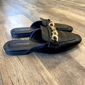 Featuring a sleek black design accented with a luxurious gold chain, these mules are the perfect blend of elegance and comfort.