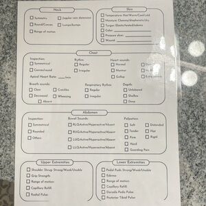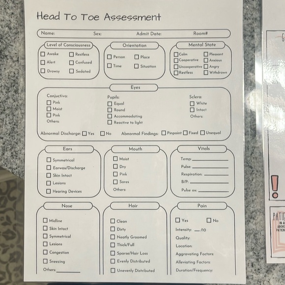 Laminated study tools for healthcare students. Head To Toe Assessment and Pharmacology laminated pages. Use dry erase marker and re-use many times. Great study tools!!