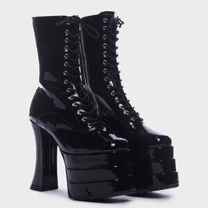 Lamoda " THE BLACK PATENT STALLION " Platform Boots cuz you're not a follower. These boots come in a patent vegan leather construction, with a stacked platform heel, lace up front details, and an inner zip closure.