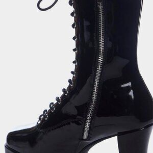 Lamoda " THE BLACK PATENT STALLION " Platform Boots cuz you're not a follower. These boots come in a patent vegan leather construction, with a stacked platform heel, lace up front details, and an inner zip closure.