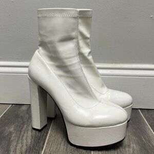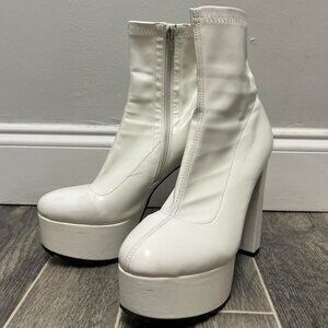 white faux leather, platform boots, ankle boots, chunky heel, statement footwear, size 8, fashionable, minimalistic, versatile, trendy