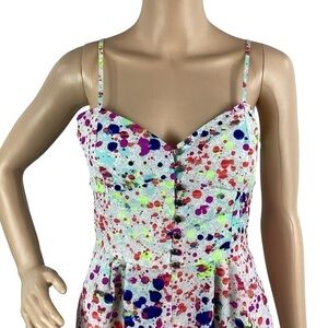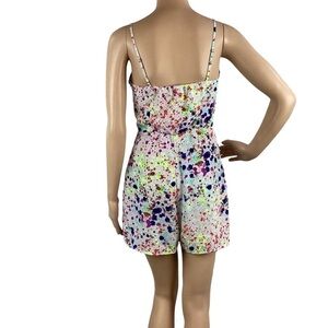 Tags: Nanette Lepore romper, paint splatter print, festival outfit, colorful romper, button front romper, summer playsuit, adjustable strap romper, casual one piece, M romper