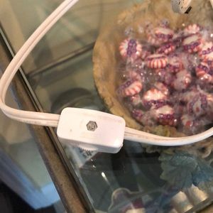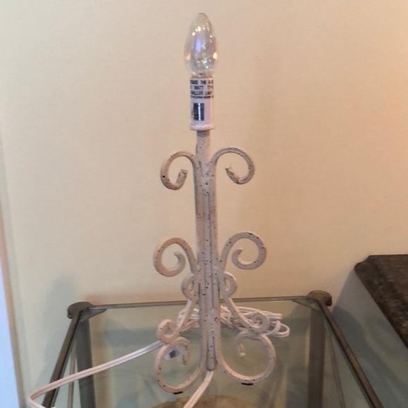 15”H metal lamp with off-white with scroll design. Lamp shade not included. Accessorize with a lamp shade of choice.