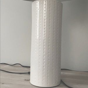 Off white lamp with white lamp shade. Lamp is detailed with small circles going down vertically.
