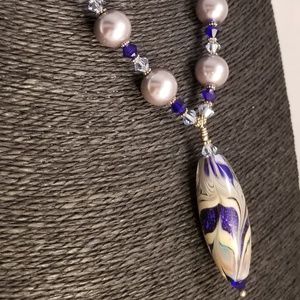 This beautiful set was made using Swarovski Elements Pearls and bi-cone crystals. The focal is a one of a kind Jeff Barber Lampwork bead in coordinating colors. The necklace has a Sterling Silver toggle clasp and Sterling Bali beads and the fishhooks and beads on the earrings are also Sterling Silver. The statement necklace is 21" long, the pendant is 2 1/2" long, and the focal itself measures 45 x 14mm.