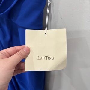LanTing Cap Sleeve Formal Evening Gown Royal Blue Bow Back Flowy Wrap Front