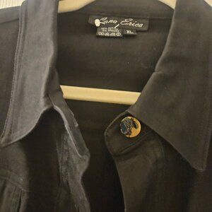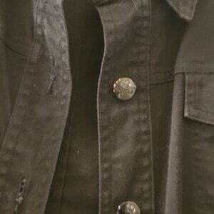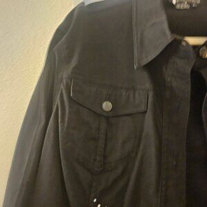 This is a black jacket that reminds me of a jean jacket that could have a western Flair if you wanted to wear boots without. It has pretty Floral embroidery on each side and pockets for convenient.