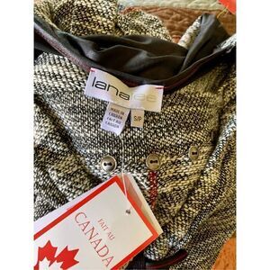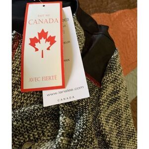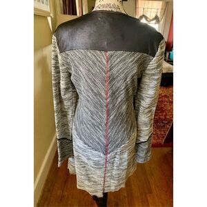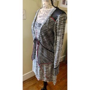This is a very lovely long sweater in the art-to-wear design sold under several labels including Lanalee, Ravel and Lei. This piece has a certain French inspiration or, one may say, panache. Square neck, black faux reptile design with a tie- front...full bottom hem... sculptured hi-low bottom hem. A lovely sweater that is very chic... size small.