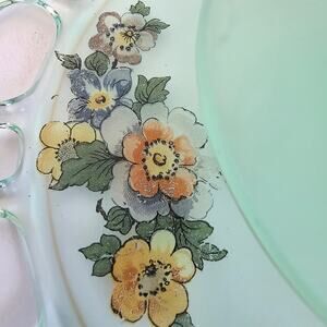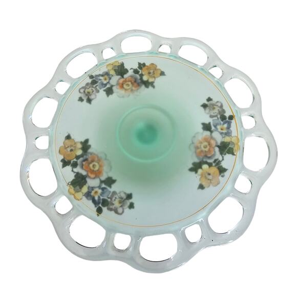 VINTAGE Lancaster Glass Plate Green Satin Glass Open Lace Reverse Painted Floral Footed Cottagecore romantic collectible