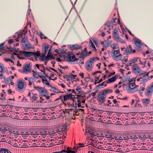 Gorgeous pink, purple paisley bohemian maxi dress. Size large. Criss-cross straps with tassel accentuates the open back.