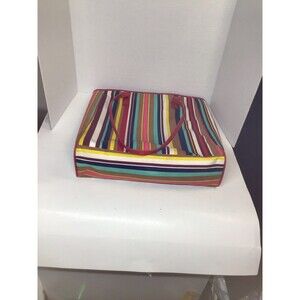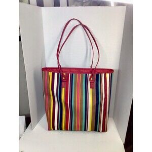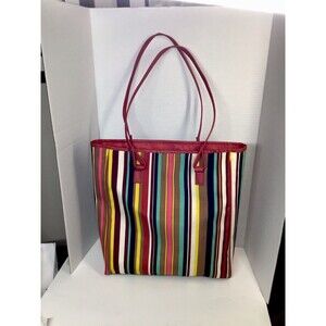 The Lancôme Canvas Tote/Travel Bag is a vintage-inspired large-sized handbag with a Striped pattern and Pebbles character. The bag features red leather double handles, a red nylon lining, and a Multicolor canvas exterior. With a beach theme and brushed finish, this tote is perfect for travel occasions and adds a touch of luxury to any outfit. The bag has a vintage flair and is a stylish choice for women looking for a practical yet fashionable accessory. There is 2small blemishs on the outside and one on the inside lining. Refer pic.s.