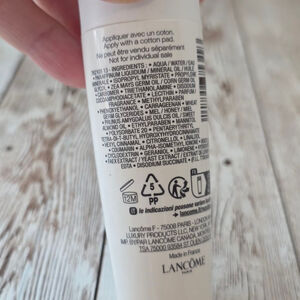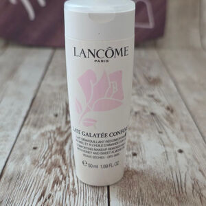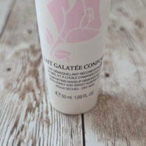 This is a Lancôme Paris 'Lait Galatée Confort' comforting makeup remover for dry skin. The bottle is white with a pink rose design and black lettering. It contains 50 ml / 1.69 fl oz of product. The item is new without tags or box. There are no visible imperfections on the bottle. The bottle is made of plastic and has a white cap.
