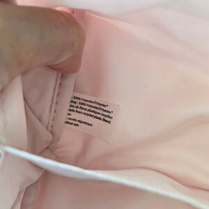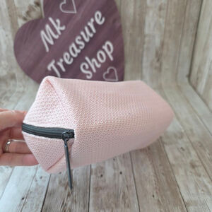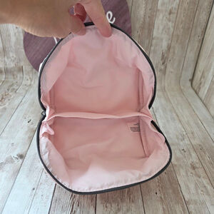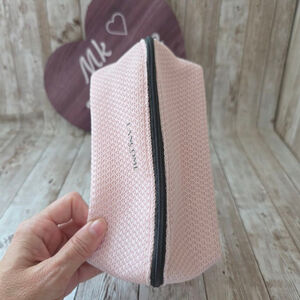 This is a Lancôme cosmetic bag, new without tags or box. The exterior is a light pink, textured polyester fabric with the brand name printed on one side. It features a black zipper closure. The interior is lined with a smooth, light pink polyester fabric and includes a divider. The bag appears to be in excellent condition with no visible imperfections.