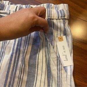 Stylish and comfortable Land’n Sea women's shorts featuring a classic blue and white stripe design. Linen Blend . XL with elastic waist and draw string .