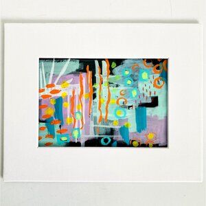 This exciting wall or desk art piece includes expressive artist’s brush strokes and wax crayon & oil pastel accents. The colors include pink, mint green, turquoise, orange and yellow on a dramatic black background.