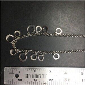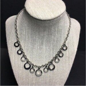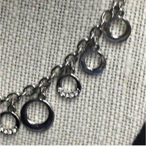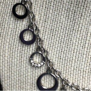 Landau brand tag, silvertone necklace featuring circle dangles, some with rhinestone sparkle detail! Approximately 16 inches long, with 3 inch extender and lobster claw closure!