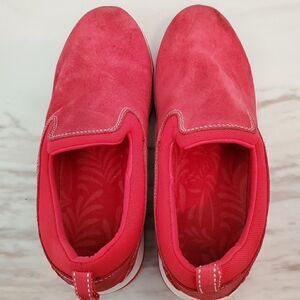 Land's End women's slip on shoes. Size 9B. V#2442. Lightweight. Dual density sole for traction. All weather. They have been cleaned but there is a tar spot on the sole as noted in pictures. Shoes themselves have no tears or stains. The color is between a red and pink.