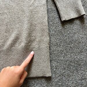 Sweater is in very good pre loved condition. There is a small discoloration on the front center of the sweater and a small spot on the front bottom as shown in close up photos. Besides for that there are no rips, pilling, pulls or other flaws to note. See photos for its condition.