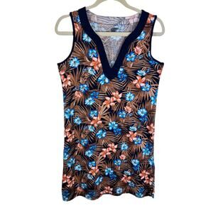 Excellent preowned condition. Floral/palm leaf pattern sleeveless split neck lightweight pullover knee length dress/coverup. Has open pockets at waist. Has some stretch. 100% cotton material. Approx. measurements: Shoulder to hem 36", pit to pit 19". Size S.