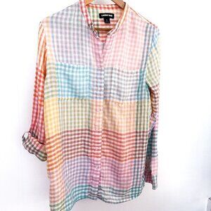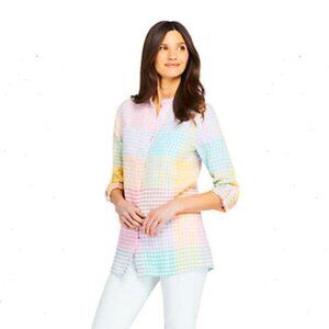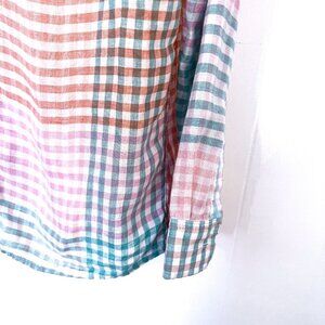 Lands’ End 100% Linen Roll Sleeve Tunic Top Shirt White Rainbow Plaid Small 6-8