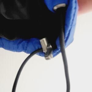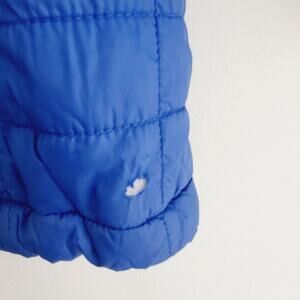 Lands End blue light but warm puffer hooded coat size 8. Has small tear in back near bottom hem. Zippered pockets on front. Drawstring on bottom.