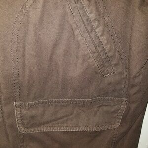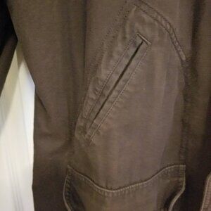 Classic barn/field jacket in dark brown with matching corduroy collar. Features a button-up front and spacious pockets. Quilted inner lining for insulation, button up front, with inside pocket. Very gently used. Ideal for cool fall through winter and spring.