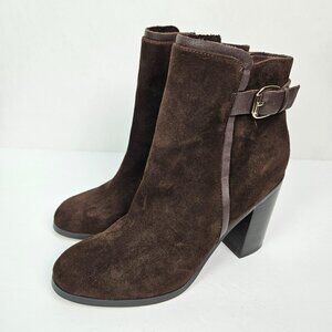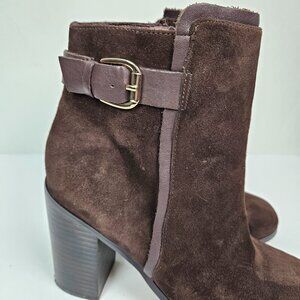 Lands' End Ankle Buckle Boot in Spice Brown Suede/Leather, size US 9. Inner zip, stacked heel, suede upper with leather trim accents, gold tone buckle leather strap ankle detail. Excellent pre-owned condition.