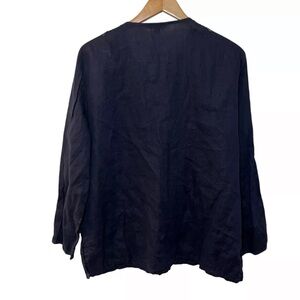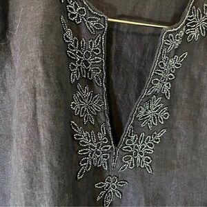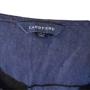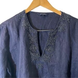 Lands End Beaded Blouse Large 100% Linen Embellished Dark Blue V Neck Woven Top