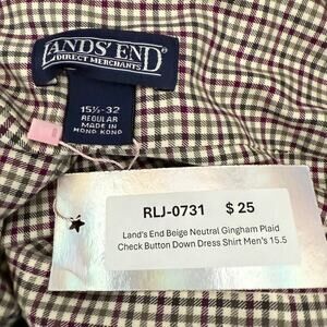 This classic Land's End dress shirt features a timeless gingham plaid pattern in neutral beige tones. Perfect for adding a touch of understated style to your wardrobe!