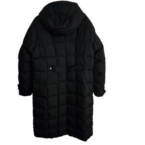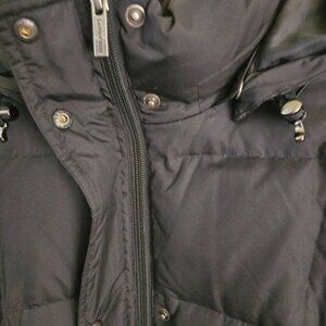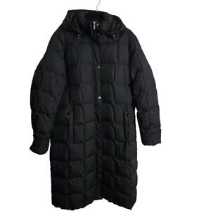 Stay warm and stylish with the Lands' End Black Down Puffer Coat. Featuring a removable hood, inside and outside pockets, and snap zip closure, this coat offers practicality and elegance. Excellent Pre-Owned Condition