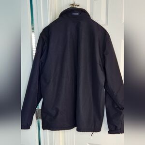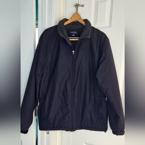 Lands End Fleeced Line Polartec Jacket (L) 42-44 . This is a black jacket lined in dark gray fleece. It has windproof nylon shell fabric, adjustable hook-and-loop cuffs, zippered front welt pockets, interior zipper pocket as well as adjustable feature at waist.
