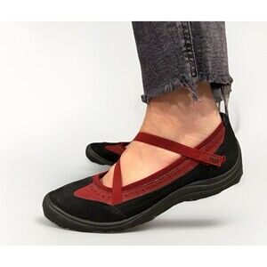 Lands End Black Red Suede Flats Walking Shoes Size 9 Comfort Hook Loop Adjust